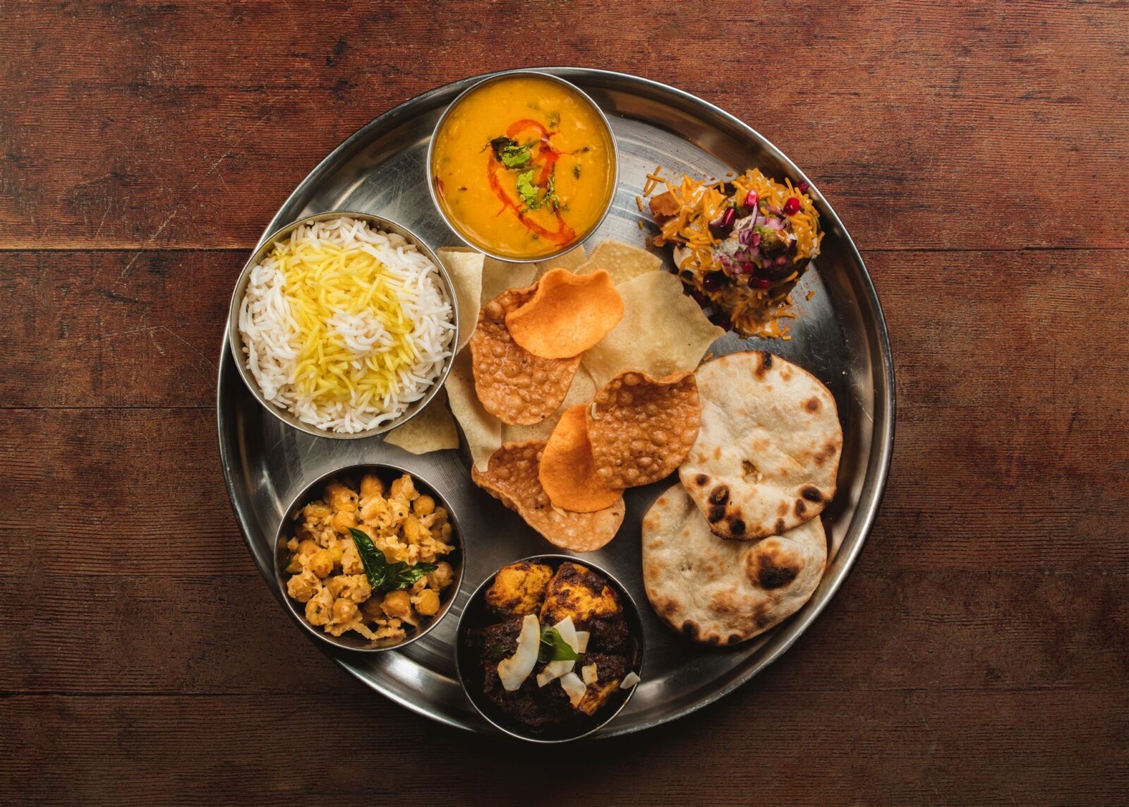 A classic thali. Served on a round platter, with a delicious medley of small dishes, a thali a balanced meal that’s a feast for the eyes. Our lunch thali comes with papads, samosa, yellow daal, poriyal (veggies and greens), steamed rice, plain naan and a choice of main dish including seasonal veg curry, chicken pepper fry or lamb bhuna – we think it’s the perfect platter.